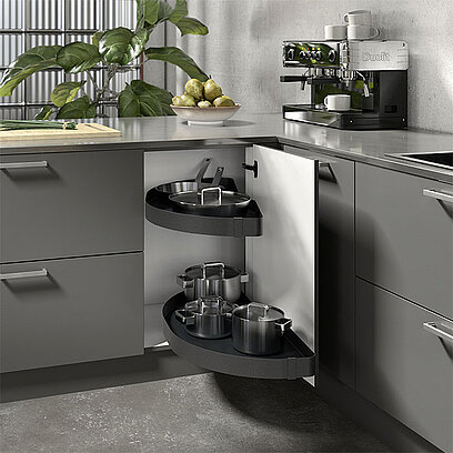 More order in tall, base or corner cabinets: Hettich's sophisticated, high-quality fittings for cabinet interiors optimise storage space behind furniture fronts and enhance it with innovative functions.